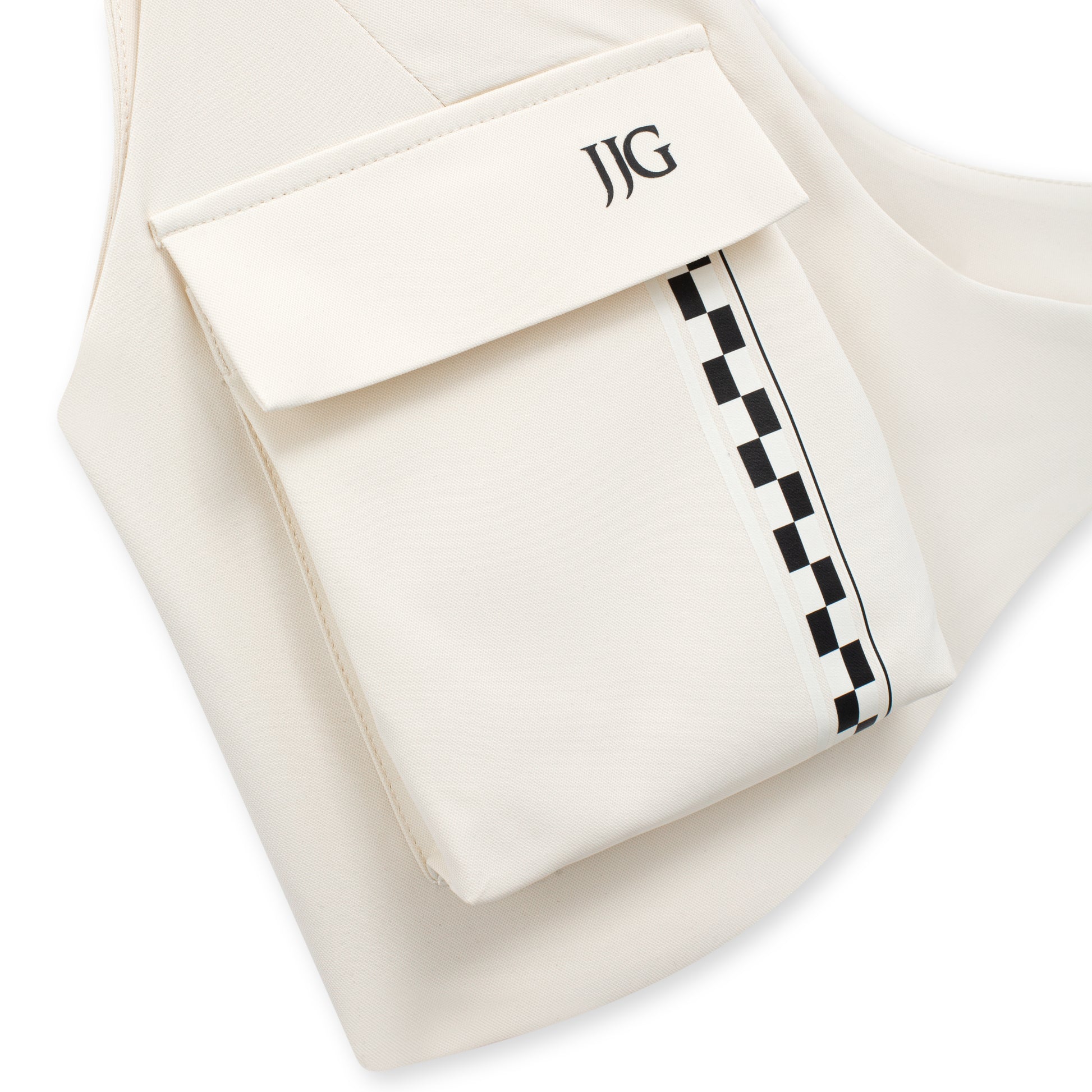 - Asymmetrical harness-style top with an adjustable buckle closure. Features a structured pocket with a flap, adorned with a "JJG" logo and a black-and-white checkered stripe detail.